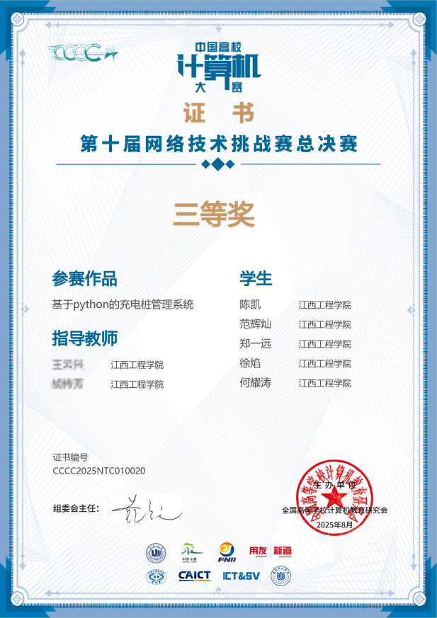 8月29——31日,由全国高等学校计算机教育研究会主办的2025年度“中国高校计算机大赛——网络技术挑战赛”决赛在温州隆重举行。本届赛事汇聚了浙江大学、桂林电子科技大学、南京航空航天大学、武汉大学等国内知名高校,经过层层选拔与激烈角逐,江西工程学院人工智能与数据科学学院2支参赛队伍闯入C4-NET挑战赛全国总决赛,荣获全国一等奖和三等奖各1项。其中,该赛项全国总决赛一等奖的获得实现了学校在该领域的历史性突破。