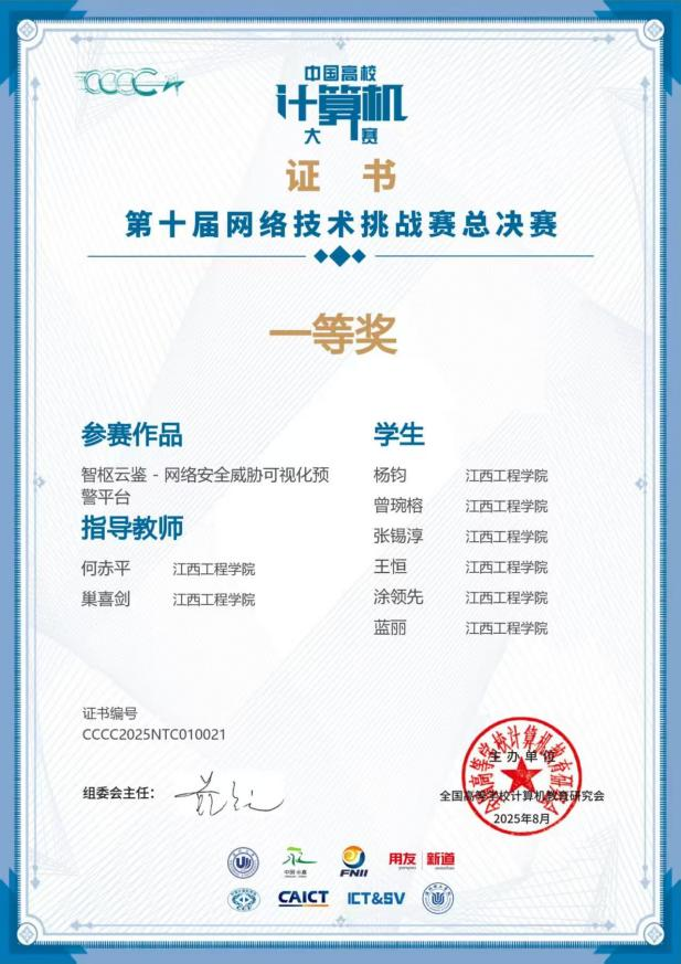 2025年赛事以“数智赋能,安全护航”为主题,聚焦网络技术、人工智能与安全领域的深度融合,吸引全国405所知名本科院校3021支队伍的14345人次报名参赛,集中展现了我国本科高校在网络技术创新创业教育领域的顶尖水平。本届大赛自3月启动以来,在何赤平、巢喜剑老师精心指导下,经过区域赛、挑战赛层层选拔,决赛现场精彩纷呈,在140支队伍的龙争虎斗中,江西工程学院以杨钧同学为队长的队伍异军突起,荣获全国一等奖,展现了非凡的计算机和工程实践创新能力。