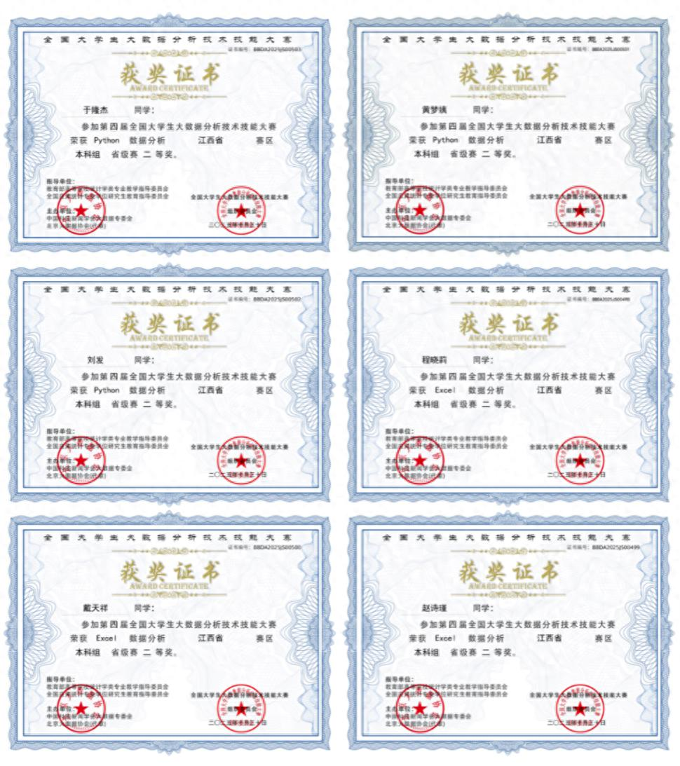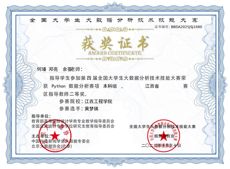 全国大学生大数据分析技术技能大赛是国内大数据分析领域的权威赛事,也是教育部认可的84项学科竞赛之一,大赛旨在检验和提升学生的大数据分析与应用能力。此次比赛中,学院领导高度重视,在何璠、邓亮老师的悉心指导下,于隆杰、刘发、戴天祥、黄梦姨、赵诗瑾、程晓莉六位参赛学生积极备赛,在数据清洗、建模分析、可视化呈现等多个环节展现出过硬的专业素养,均获得省级二等奖。