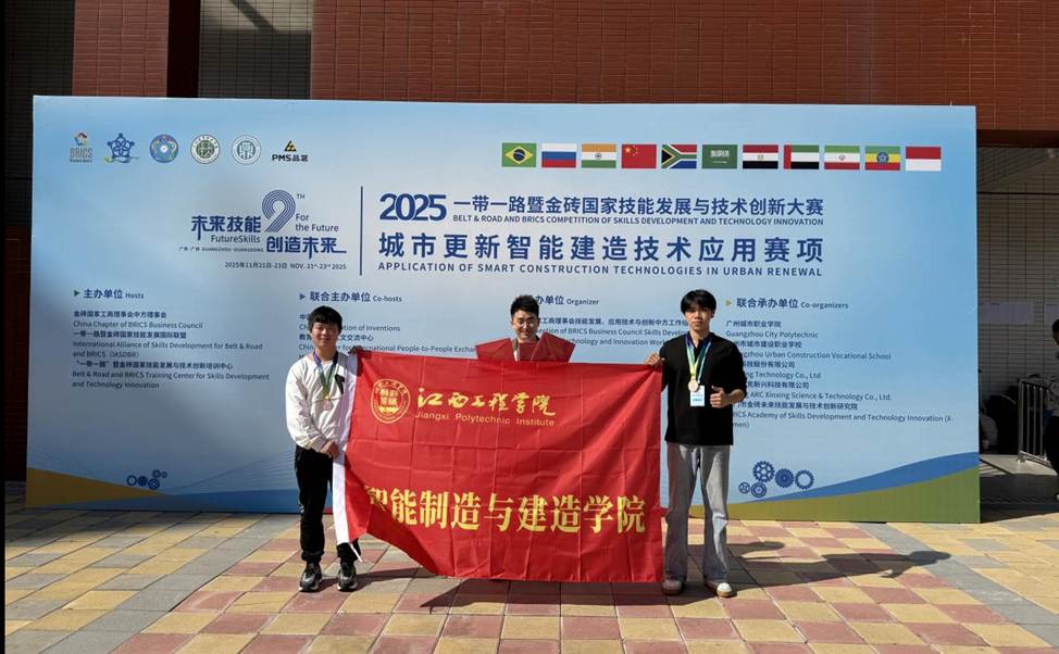 近日,2025一带一路暨金砖国家技能发展与技术创新大赛“城市更新智能建造技术应用赛项”全国总决赛在广州圆满落幕。经统计,此次大赛共有来自全国30个省、市、自治区的238所高校、785支队伍踊跃报名,参与热度空前!经过层层选拔与严格评审,最终400支实力强劲的队伍成功会师广州,在全国总决赛的舞台上展开最终角逐。其中由江西工程学院智能制造与建造学院组成的第一队(队长:刘仁、队员:肖嘉宝、徐洋;指导老师:陈水根、李红艳)在此次大赛中荣获全国三等奖。
