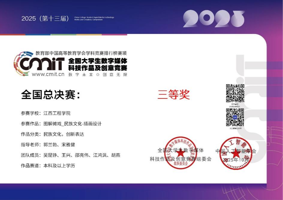 全国大学生数字媒体科技作品及创意竞赛是由中国人工智能学会等主办的全国普通高校大学生A类竞赛,已连续举办十三年。本届大赛高手云集,以“科技引领未来,创意变革时代”为主题,聚焦智能科技与创意设计深度融合,吸引了包括众多“985”“211”“双一流”高校在内的全国上千所院校、数万支团队报名参赛,竞争空前激烈。自九月份参赛以来,学院领导高度重视,指导老师认真负责,从省赛到国赛,师生通力合作,反复打磨作品细节,从精细化场景建模到全流程作品调试,最终在全国舞台上自信展示,赢得了评委的高度认可,彰显了江西工程学院在数字科技领域的育人成效。
