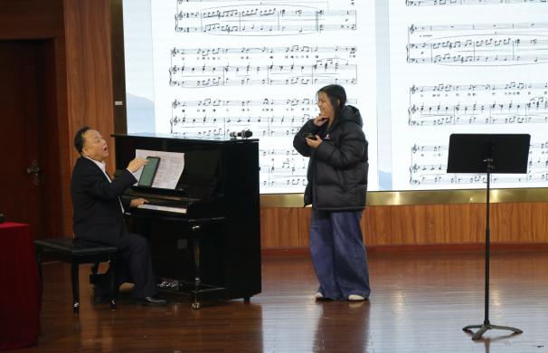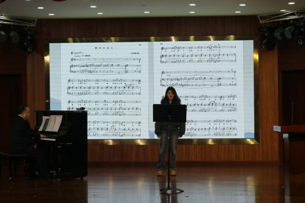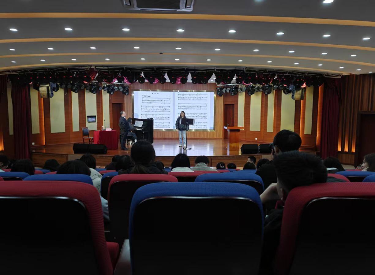 黄文涛以优美旋律深情演绎了意大利经典名曲《重归苏莲托》,其歌词如诗如画,细腻描绘苏莲托小镇的海浪荡漾与果园金黄风光,唤起听众对故乡的无限眷恋。紧接着,黄珍珍同学以典雅高洁的艺术风格,倾情诠释刘雪庵的《飘零的落花》,歌词借落花隐喻人生漂泊,深刻体现了作曲家对社会现实的深刻表达。洪教授在训练过程中,始终秉持因“才”施教的原则,针对每位演唱者的技术问题提出个性化练习方法,从而进一步完善了他们的演唱技巧与艺术表现力。