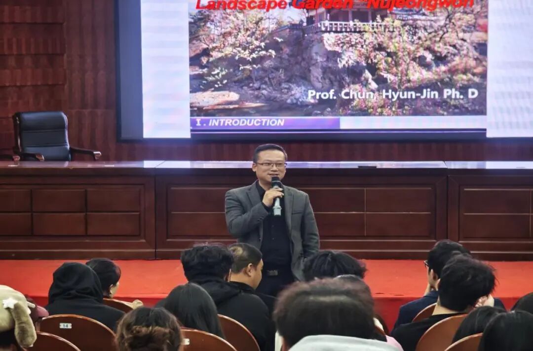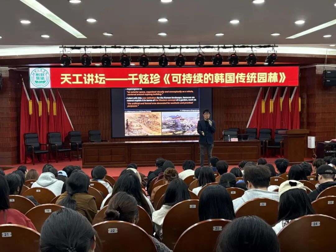 讲座中,千炫珍教授从韩国传统园林的历史渊源切入,系统阐释了其在空间布局、植物配置、材料运用等方面的特色,重点剖析了“可持续理念”在韩国传统园林中的体现——如何通过对自然生态的尊重、本土材料的循环利用以及人文意境的营造,实现园林景观的长效发展。他还结合韩国首尔市线性公园设计、三星集团生态溪塘设计等国际项目案例,生动展示了传统园林智慧与现代设计实践的融合路径,让在场师生对跨文化景观设计有了更直观的认知。